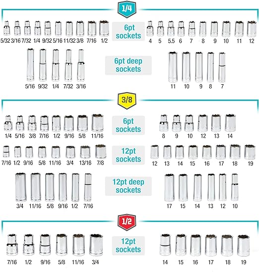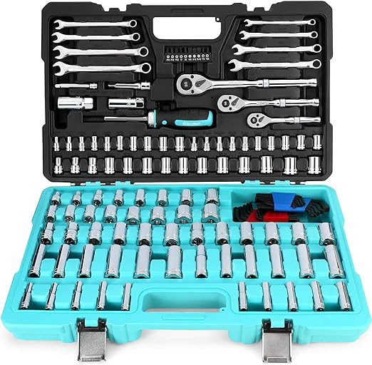 - Kit Includes: 138 piece hand tools kit including 1/2"-1/4"and1/8" Metric/SAE Sockets, Ratchet handle, Extension Bars, Combination Wrench, Spark plug sockets, Magnetic bit driver, Hex keys.