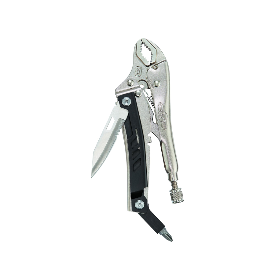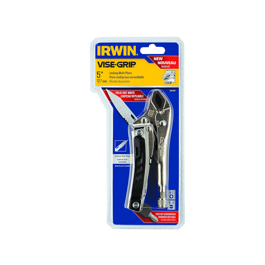 Introducing the IRWIN VISE-GRIP 5" Curved Jaw Locking Multi-Pliers, the perfect tool for any tradesman. Featuring a fold-out stainless steel serrated knife blade and screwdriver, as well as a 1/4" bit holder with 6-8 slotted and #2 Phillips bits, this four-in-one design will save you time and space on the job. Trust the legendary locking plier performance that IRWIN has been providing since 1924.