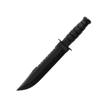 The 2211 Kraton Handled Big Brother knife features a 9 3/8 in. blade made from 1095 Cro-Van steel, with a non-reflective, epoxy coating and top edge serrations for precise and durable cutting. The black Kraton G handle offers a comfortable and secure grip. This knife has an overall length of 14 3/8 in. and comes with a black leather sheath for easy carry. Perfect for special order items.