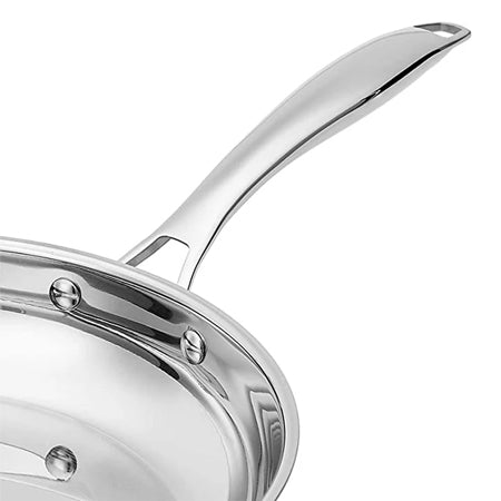 - Riveted stainless steel handle stays cool to the touch during stovetop preparations