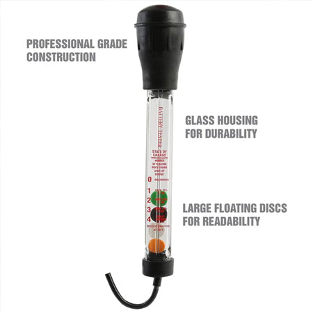 Specific Gravity Hydrometer: Our full-sized battery hydrometer uses specific gravity and the number of floating discs to show state of charge; Large 16.25-inch professional disc-type automotive battery tester