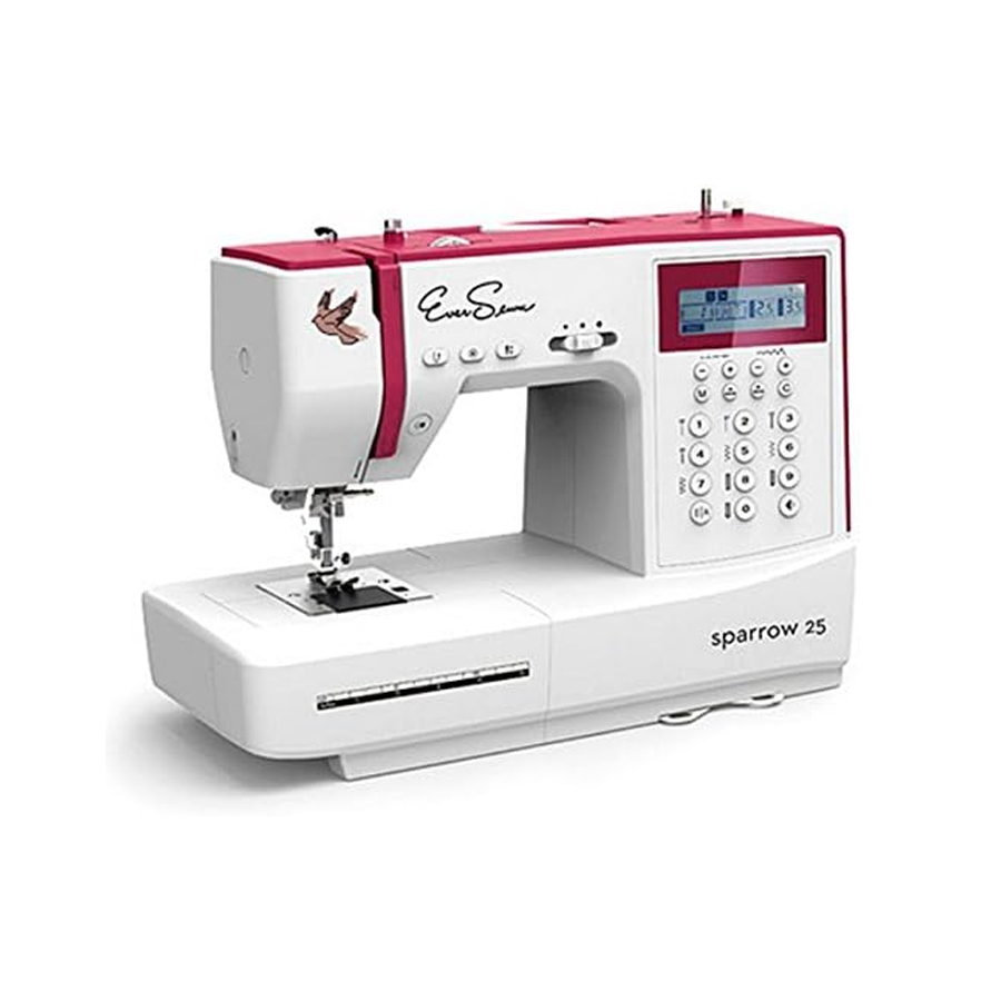 As the top model in its series, the EverSewn Sparrow 25 offers 197 stitch patterns, including an alphabet, buttonholes and eyelet stitches. With a maximum width of 7 mm for decorative stitches, the computer-controlled Sparrow 25 also has a memory function and user-friendly features like slide speed control and a bright sewing light. Bundle includes bonus bobbins and a 6-piece accessory foot kit.