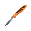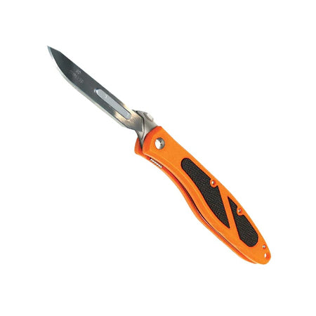 As a product expert, I highly recommend the 61182 Havalon Piranta Folding Knife. This knife features a Quick-Change Skinner, 4 1/4" closed liner lock, and 2 3/4" skinner blade with dual thumb studs for precise cuts. The package also includes 12 additional "easy-on, easy-off" stainless replacement blades, making it a versatile and practical choice. The blaze orange ABS plastic handles provide a secure grip, while the bonus black nylon belt sheath allows for convenient and safe transport. Upgrade your knife collection with the Havalon Piranta Folding Knife.