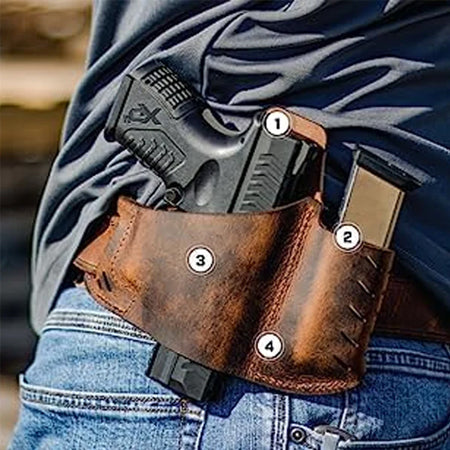 The Versacarry Commander Leather Holster provides outside the waistband carry for most pistols, plus extra space for a spare magazine. Crafted in the USA and available in various sizes, this holster offers a secure and comfortable fit for your firearm. Convenient and reliable, it's a must-have for any gun owner.