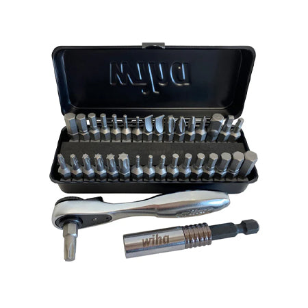 Introducing the 74996 35 Piece Bit Ratchet Compact Storage Box Set. Featuring a reversible 1/4" bit ratchet with 72 teeth for precise adjustments in tight spaces. The set also includes a metal storage box, a locking magnetic bit holder, and 33 bits for a variety of tasks. Dominate any job with ease and efficiency.