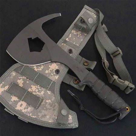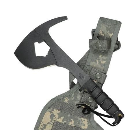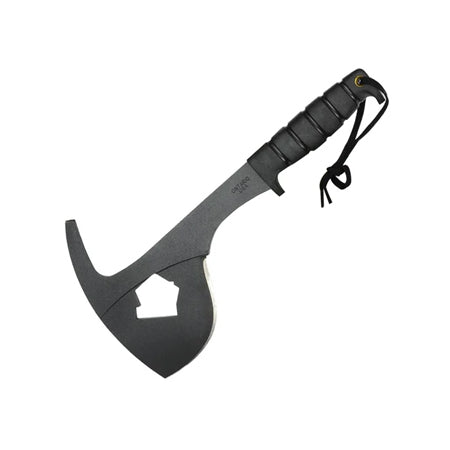 The SP16 SPAX Knife by Ontario Knife is a versatile tool for military, sporting, and rescue purposes. With its knife, hatchet, and pick axe capabilities, it is suitable for any situation. Made with high-quality materials and craftsmanship, this product is a trusted supplier to the U.S. Government and military. Its epoxy textured and powder coated steel blades offer durability and strength.