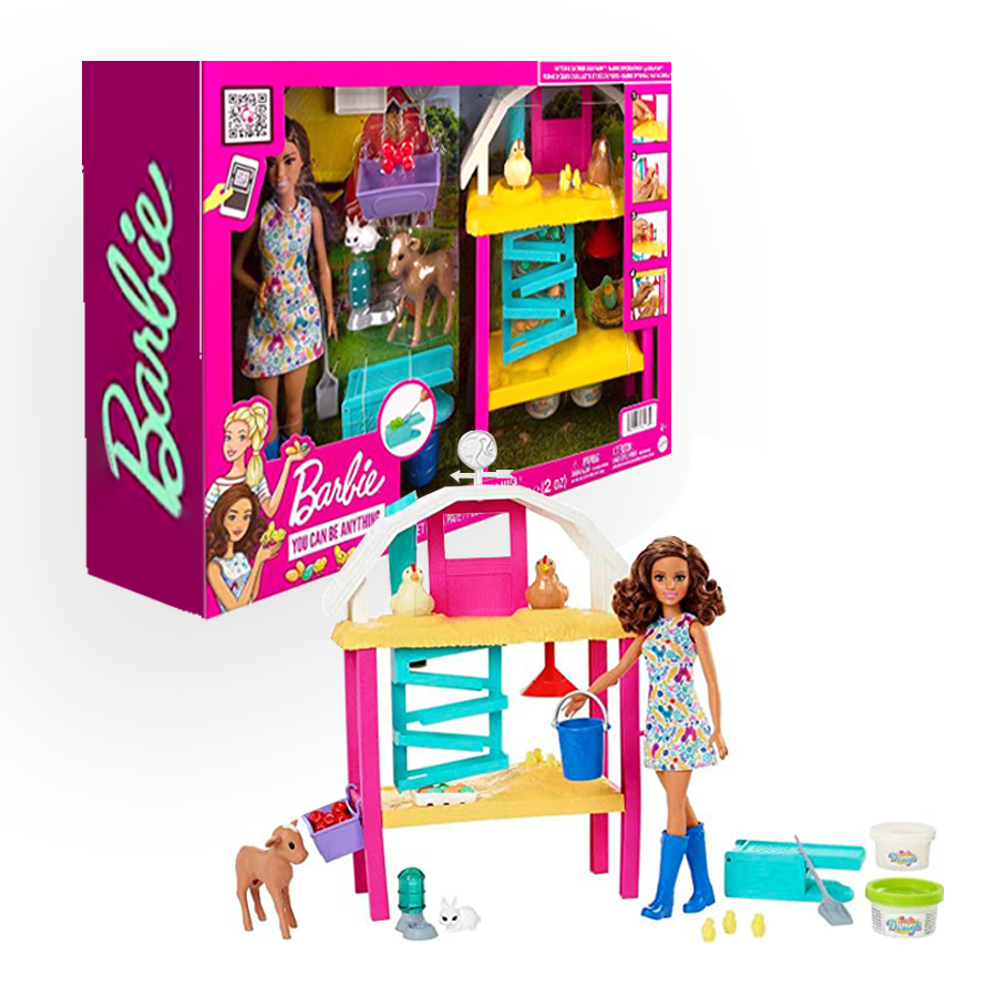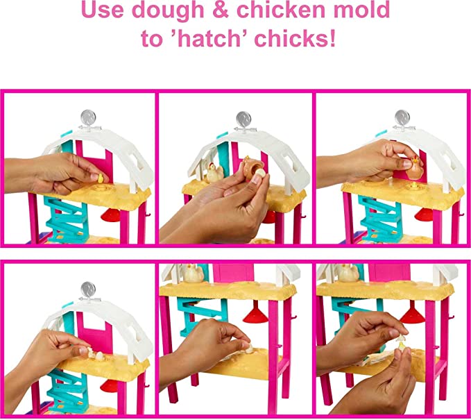 Barbie the playset has a realistic egg hatching feature where kids use dough to create eggs in the mold and 'hatch' baby chicks! The fun really starts as kids help the hens 'lay eggs' that roll down the chute and collect into the carton.
