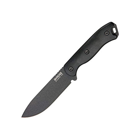 The Becker Short Drop Point Knife boasts a solid one-piece design, making it durable and sturdy for any task. Its compact size and clip point blade offer versatility and precision in a lightweight form. With full tang construction and a black epoxy powder coat, this knife also includes an extra set of handles and a Cordura sheath.