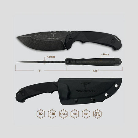 - This 8.75 inch fixed blade knife with G10 handles is a crucial emergency tool designed to fit comfortably in your hand. Its solid grip ensures safety and reliability for any task at hand. With a focus on "ease of use," this knife is an essential everyday carry (EDC) item that is readily accessible whenever needed. Additionally, its durable design allows for light duty hammer usage if necessary.