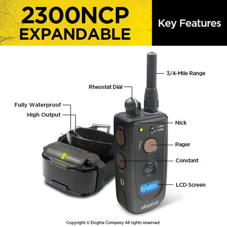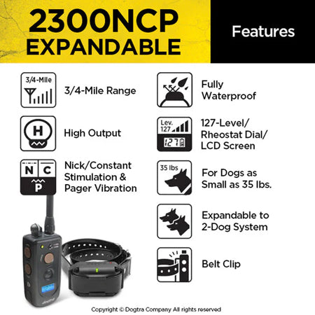 The Dogtra 2300NCP 3/4-Mile Expandable 2-Dog Remote E-Collar is a top-tier training tool designed for professional trainers and serious dog enthusiasts. With a 3/4-mile range, it offers extensive control for effective training sessions, whether for obedience, hunting, or K-9 work. This expandable e-collar allows for the simultaneous training of two dogs, featuring precise stimulation levels for tailored training. Its rugged, waterproof design ensures durability in any environment, making the 2300NCP a reliable and versatile choice for demanding training scenarios.