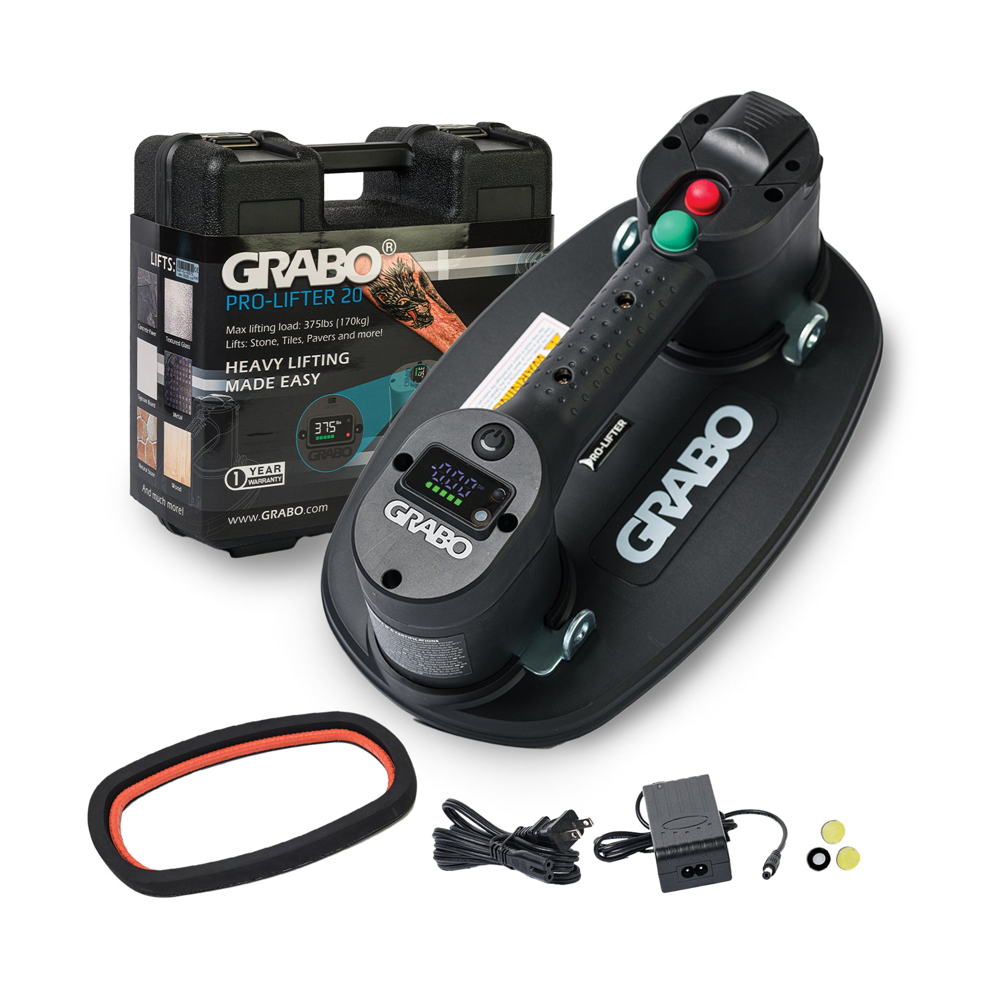 GRABO Pro Kit: The ultimate GRABO Pro-Lifter 20 tool housed in a tough, crush-proof Hardshell Case. Designed for professionals working in dirty, rugged environments, this case offers superior protection against dust, debris, and crushing, ensuring your investment remains safe when a canvas bag isn't enough. The Pro-Lifter features an innovative smart digital display on the handle, providing real-time measurements for both pressure (PSI/Bar) and weight (Kg/Lb) for precise, controlled handling. Powered by a high-performance vacuum pump that moves 20 liters of air per minute, the tool can safely lift loads up to 375 lbs (170 kgs). The kit includes one battery, a multi-socket charger, one installed seal, and a manual, all neatly secured in the durable case for transport. Invest in the GRABO Pro Kit to maximize your lifting capability and tool longevity.