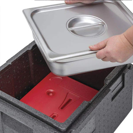 The Half-Size Fire Red Camwarmer Hot Plate is a must-have for any catering professional. With its ability to extend the hot holding time of your food by up to 40 minutes, you can confidently transport your meals in the included carrier. Simply place the hot plate in a hot water bath and at the bottom of your carrier for optimal results. Compatible with half size top loading Go Boxes.