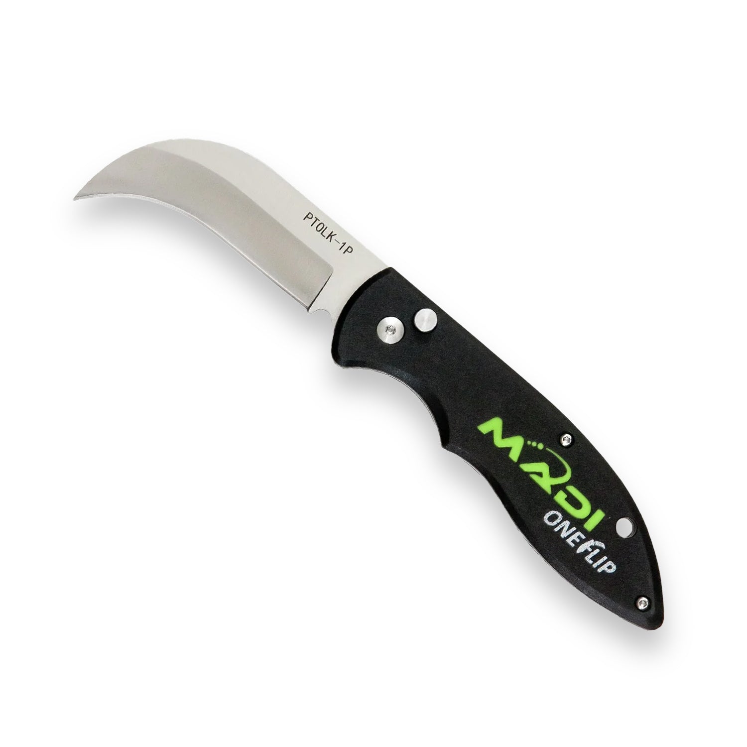 MADI OneFlip Pointed Lineman Knife (PTOLK-1P) The PTOLK-1P OneFlip is a revolution in field efficiency. Featuring a unique push-button design, it allows you to flip the pointed-tip blade open or drop it closed with one hand, even while wearing heavy work gloves. The blade remains securely locked in both positions until the button is activated, ensuring maximum safety. Crafted from high-grade stainless steel for superior durability, it includes a reversible belt clip for easy access. Perfect for precision skinning. Catalog #PTOLK-1P.