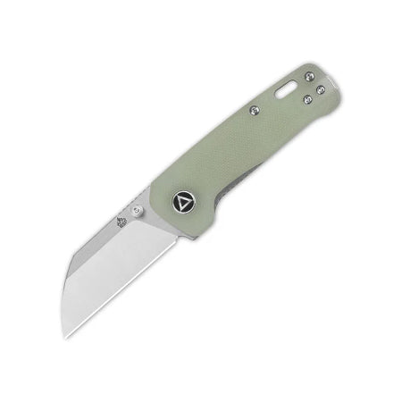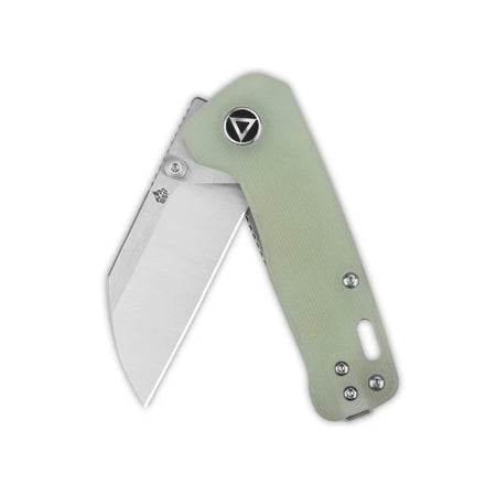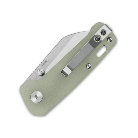 QSP KNIFE MINI PENGUIN POCKET KNIFE, 14C28N blade with variants handle scales, small size for everyday carry (satin blade, jade G10) Expertly crafted with Sandvick 14C28N steel and a jade G10 handle, this knife boasts a 2 tone satin finish for a sleek look. The liner lock and ceramic ball bearings allow for smooth and secure opening and closing. At 5.50" overall, this lightweight knife delivers precise control and a comfortable grip with jimping on the blade and a reversible pocket clip.