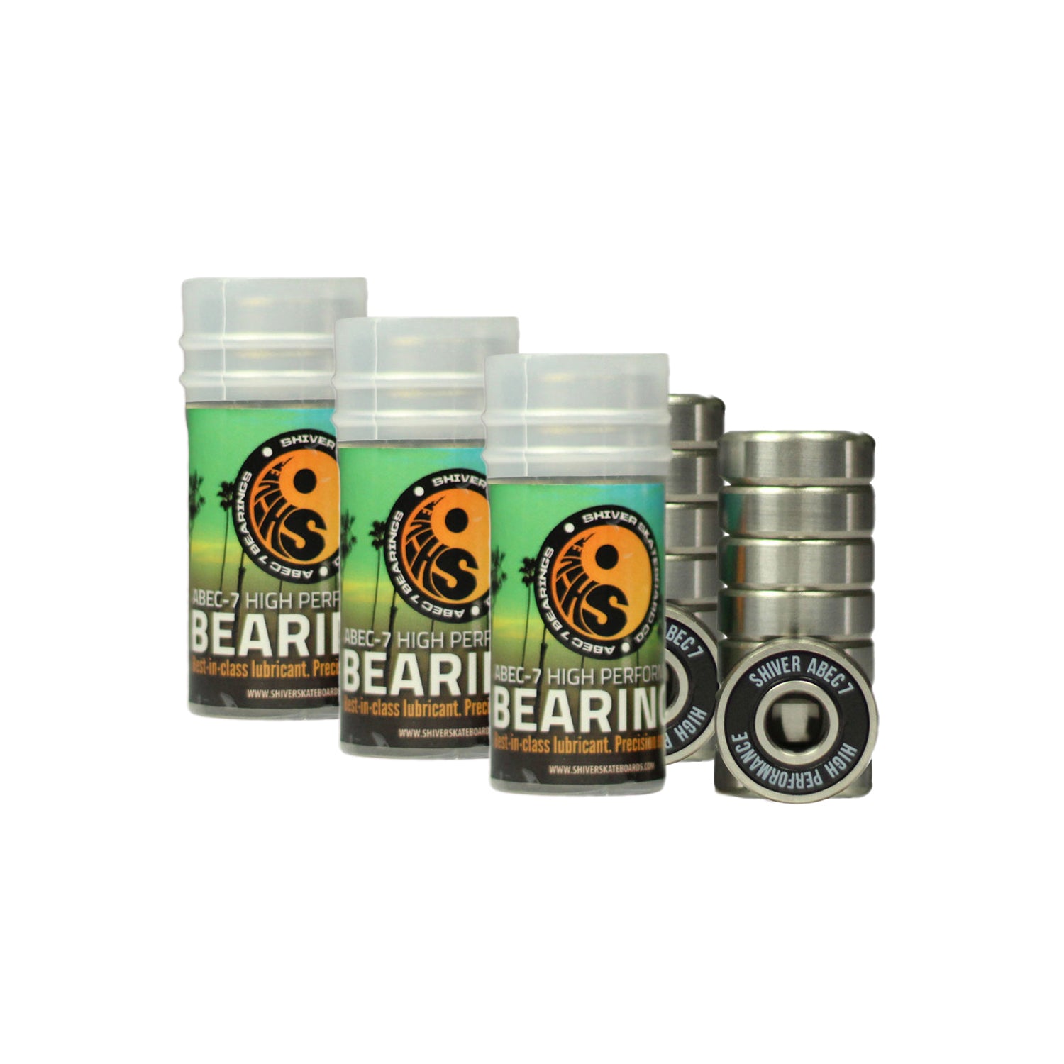 Shiver Abec 7 Bearings | These standard size bearings are anything but standard. Shiver has acquired the exclusive rights in the skateboarding industry to use Pro One’s lubricant that is used by NASA. Forget the Abec ratings, they actually mean almost nothing. The lubricant is the difference maker. Shiver’s bearings are manufactured to the highest standards and utilize Pro One’s patented lubricant. The lubricant works with friction and heat - the more you ride, the better they spin! Package contains 8 bearings. Two sets needed for Derby wheels.