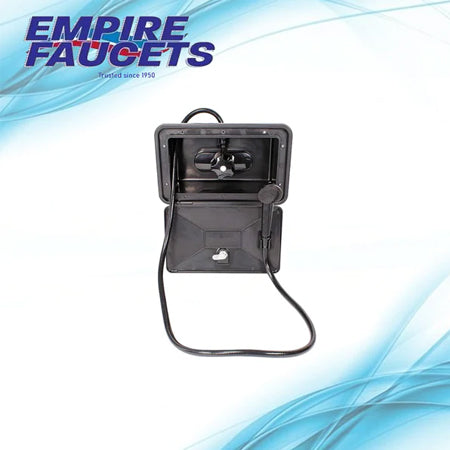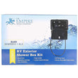 - The Empire Faucets RV Exterior Shower Box Kit is essential for RV owners. This kit includes a shower faucet, valve, camper shower head and hose, and its large 11 by 6 inch (27.9 x 15.2cm) exterior shower enclosure has a 3.75 inch (9.4cm) depth for easy installation. The 1.3-inch (3.3cm) installation lip enables mounting on any camper or trailer and sits just 1 inch (2.5cm) from the mounted surface when closed. Enjoy the convenience of cleaning your hands, pots, pets, boots, or beach gear with this must-have RV accessory.