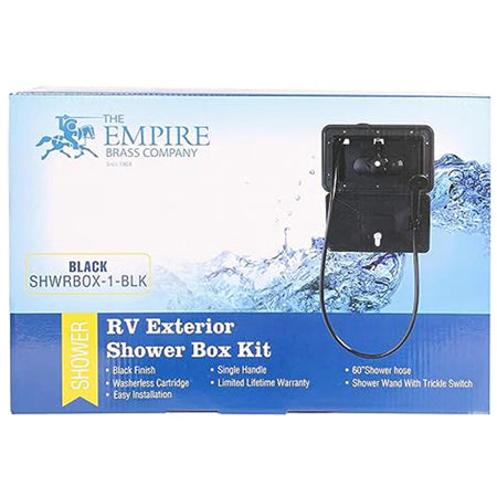 - This Empire Faucets RV Exterior Shower Box Kit has everything you need to easily install an outdoor shower to your RV. It includes a quality black RV outdoor shower faucet, a shower valve, a shower head and hose, and all necessary installation hardware. The installation process is quick and easy, and the included instructions provide detailed steps to ensure a secure and leak-free setup. Following proper maintenance and use guidelines helps ensure long-lasting performance.