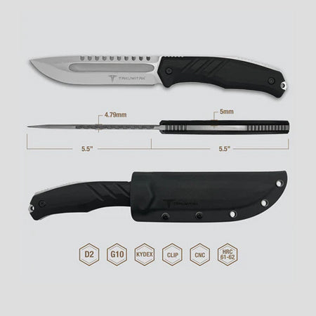 Introducing our Tactical Knife, the ultimate tool for any outdoor adventure. It features a durable D2 drop point blade and ergonomic G10 handle for precise cutting. The Kydex sheath with molle clip ensures convenient and secure carry. A must-have for camping, hunting, or emergency situations. Get yours today!