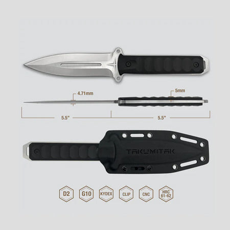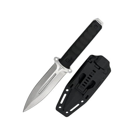 The Silver TKF214SL Tactical Knife is a versatile and reliable tool for any outdoor adventure. Made with a D2 Spear Point Blade and a sturdy G10 Handle, this survival knife can withstand the toughest tasks. Complete with a Kydex Sheath and Molle Clip, it's the perfect companion for camping, hunting, and EDC.