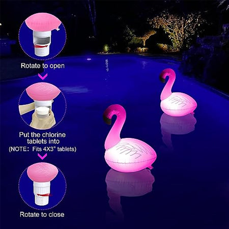 - 🦩Inflatable Flamingo Pool Chlorine Floater with Solar Light: Upgraded version. The flamingo pool chlorine dispenser is with a solar panel to charge automatically, you just need to place it under the sunshine at least 6-8 hours.It will light up automatically at night. A whole day of direct sunlight generates enough energy to nearly last a whole night.