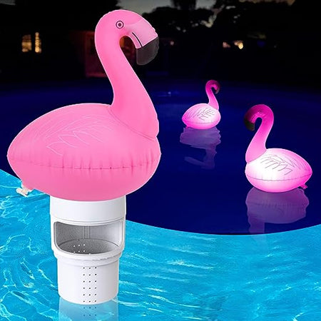 - 🦩Premium Material: This flamingo chlorine basket is made of strong and durable ABS plastic, which can prevent the color fading. The inflatable solar flamingo pool light is made of 0.3mm thick PVC material, which can withstand strong sunlight, pool chemicals, and adverse weather.Ideal for keeping in-ground pool, above ground pool, hot tub, spa or pond clean.
